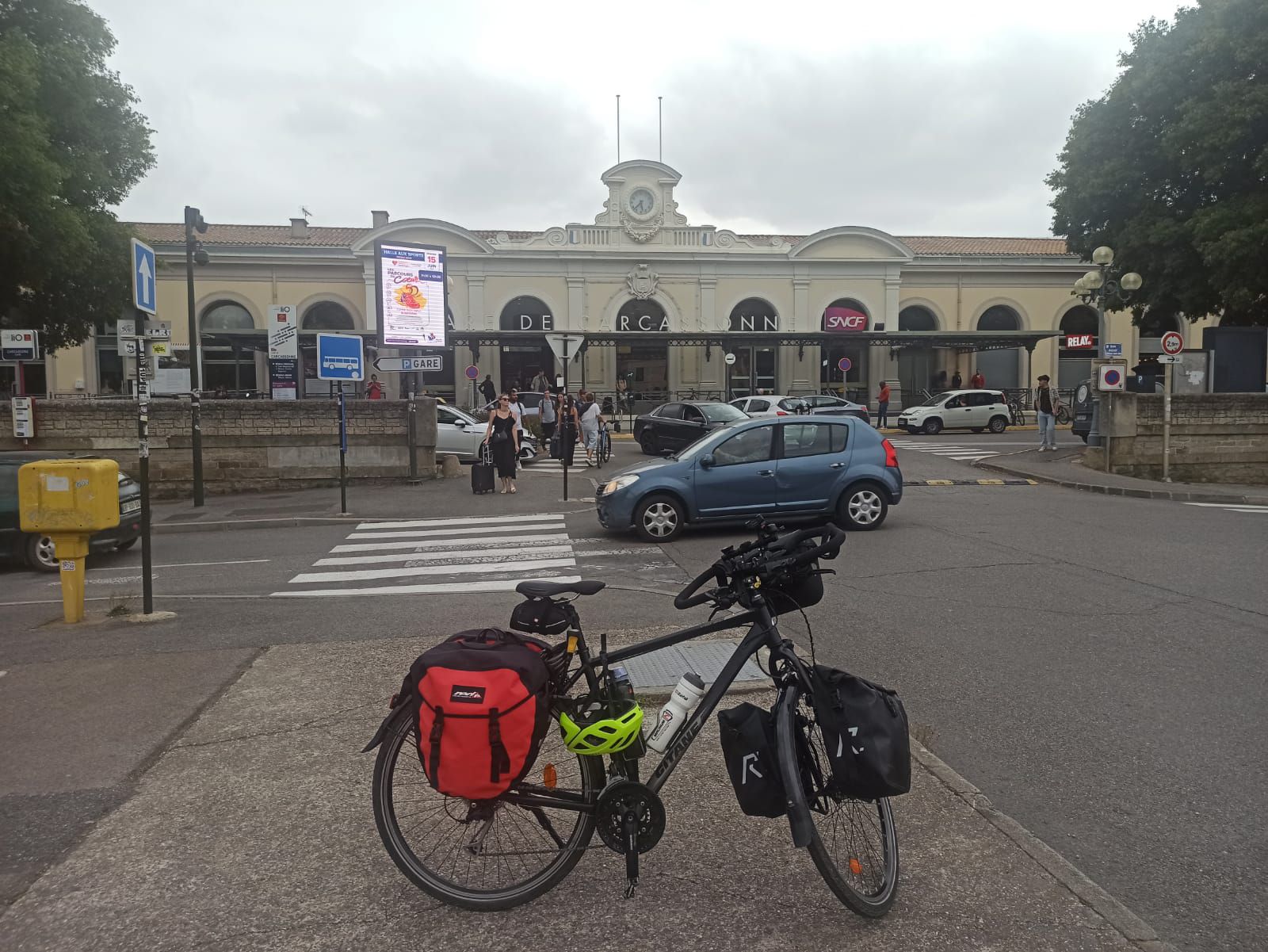 Après un trajet en train de la veille, redouté et finalement assez tranquille, j’arrive a Carcassone et rencontre un membre du club de cyclo local. Je repars avec un maillot du club, en souvenir de cette rencontre.