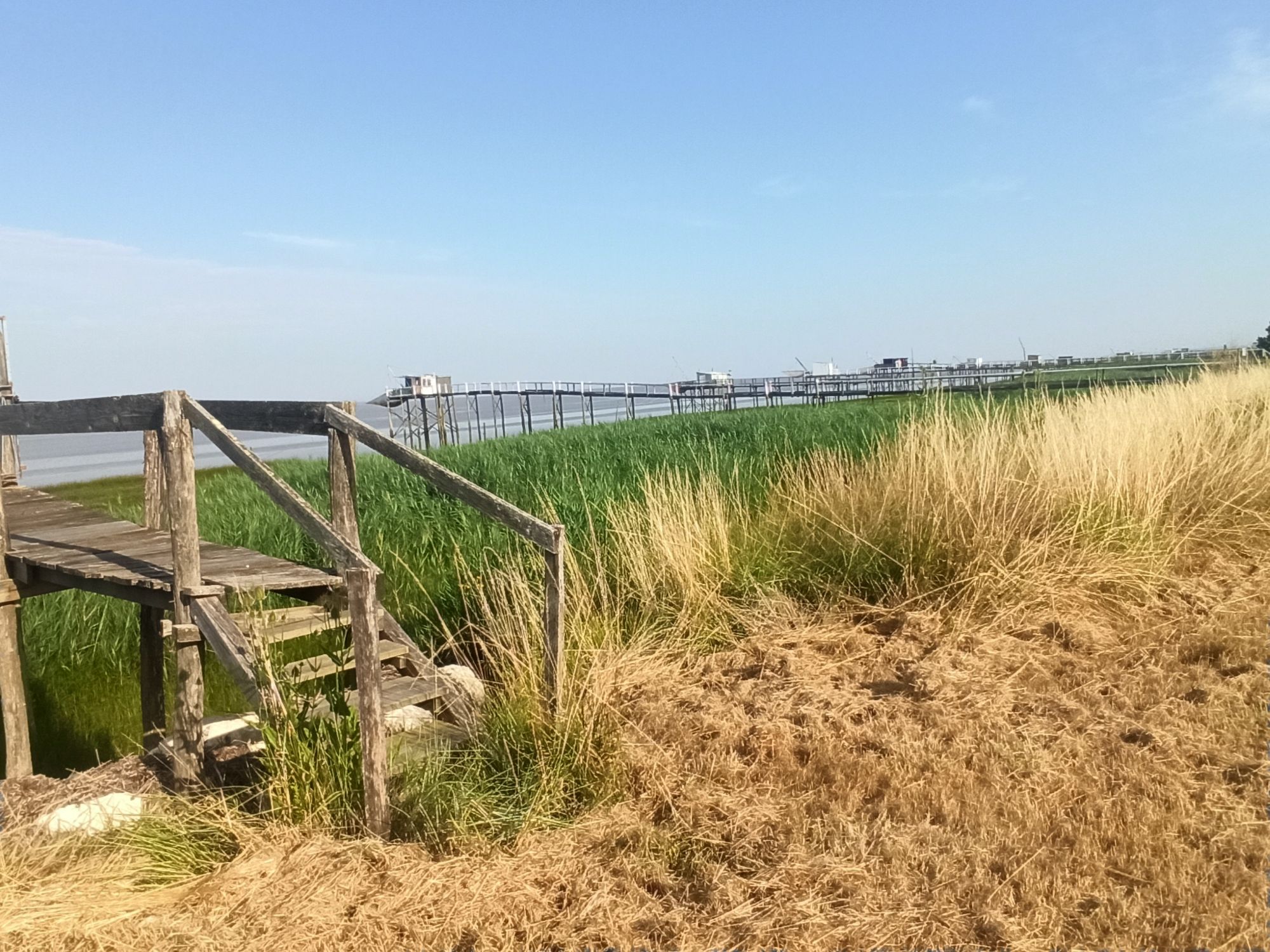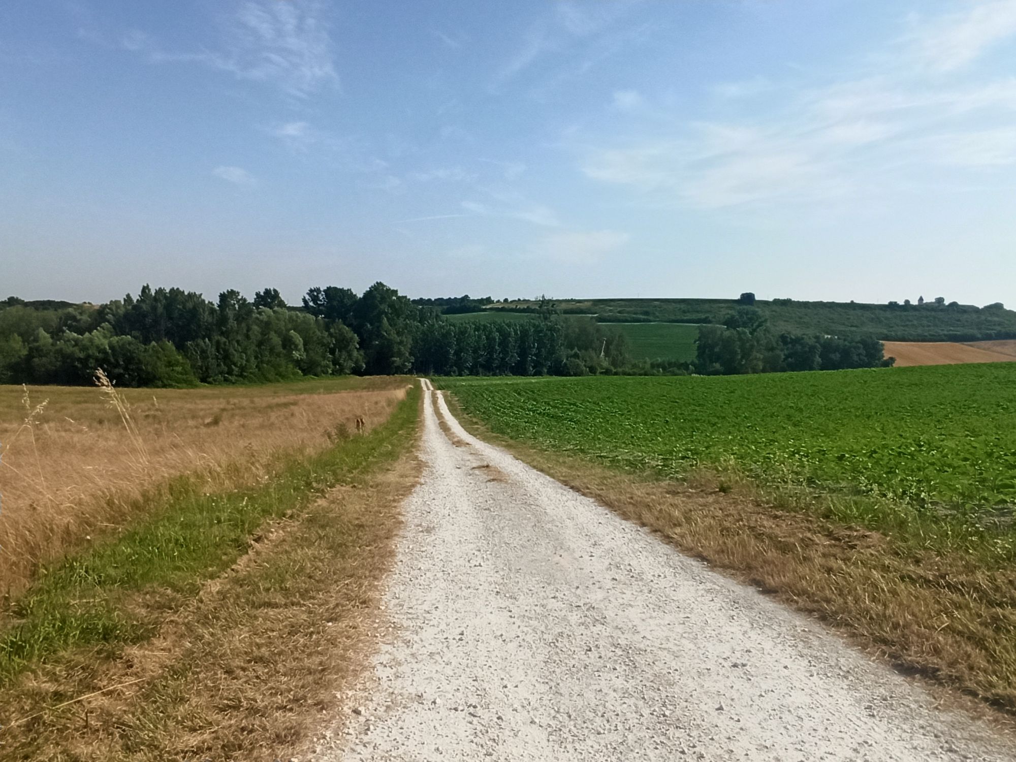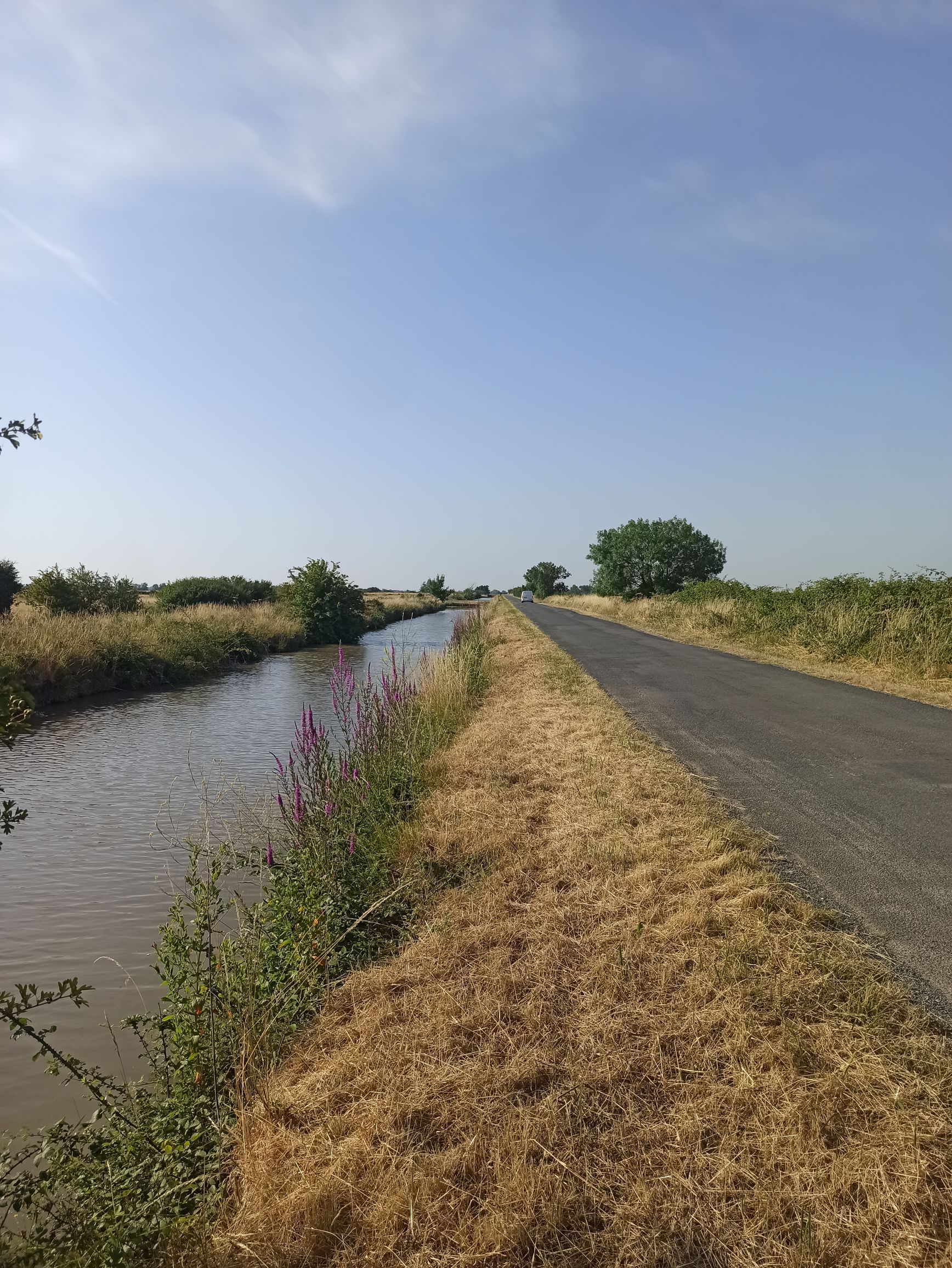L’étape commence par la piste cyclable mais va rapidement sur des routes dans les marais. Ça roule, mais aucune ombre. Heureusement que je passe à cette heure là.